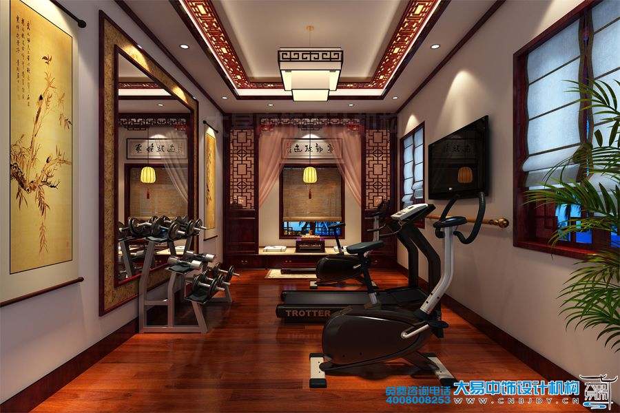 一樓中式健身房非常干凈,擺放的幾處健身器材,很有動感