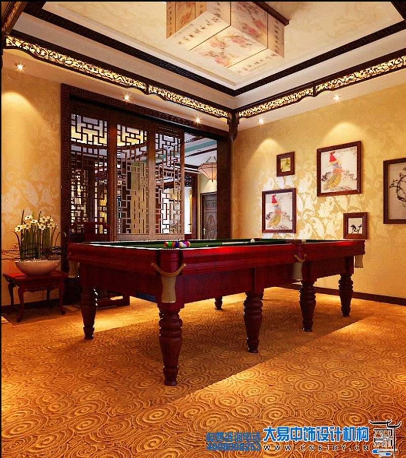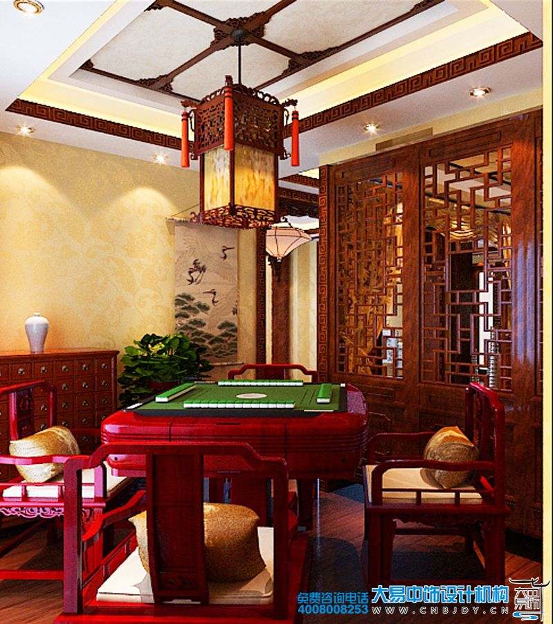 地下麻將室裝修線條簡單、裝飾元素少,中式家具完美的軟裝配合,盡顯閑適之意
