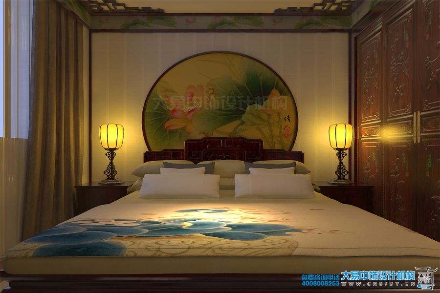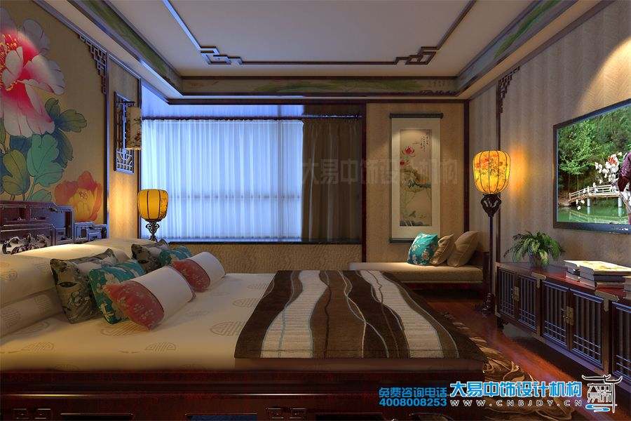 次臥裝修采用了中式風格,床頭背景墻上的中國水墨繪畫更是引人注目,表現(xiàn)出一種非凡的中華國畫的藝術(shù)感