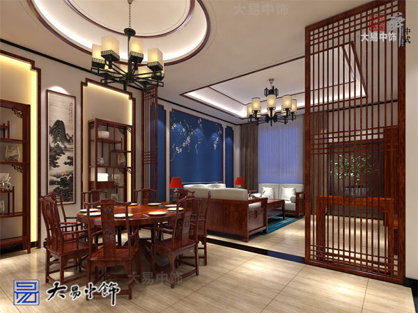 一層的餐廳和客廳在一個空間,中間用木格扇做為屏風進行分隔。
