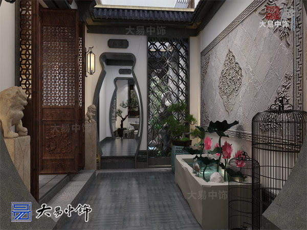 進(jìn)門處的玄關(guān)正面設(shè)計(jì)了磚雕的影壁墻作為裝飾,下面配上雕刻的荷花石槽,給人清新淡雅古韻幽香的美感。頂面采用傳統(tǒng)的帶有徽派及江南水鄉(xiāng)韻味的四水歸名堂的設(shè)計(jì)。整體打造出了室內(nèi)庭院的景觀,仿佛使人置身于江南小院。