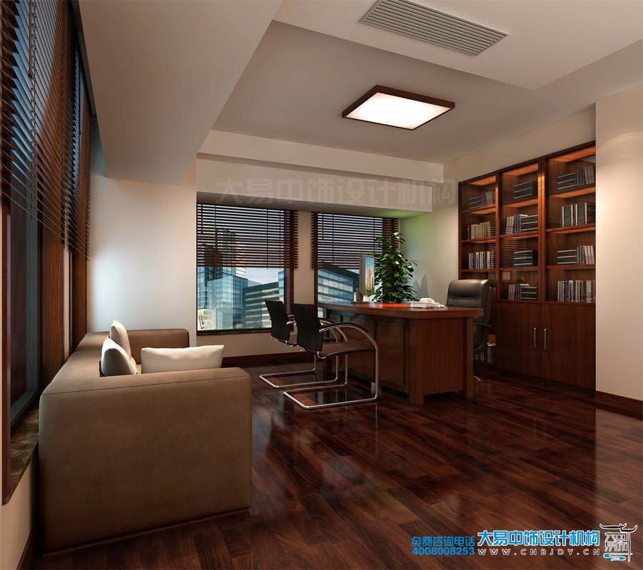 中式辦公室裝修寬敞明亮、大量采用深棕色與淺白色為主色調,凸顯出辦公室莊重大氣的正能量