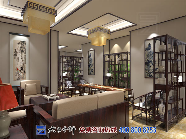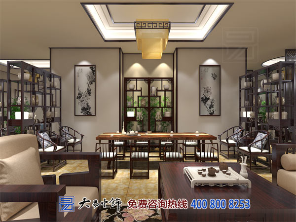 北京十里河紅木家具展廳,接待區(qū)以家居內(nèi)茶室設(shè)計(jì)裝修為原型。條形茶案,棉麻桌旗,燈光的映襯下,在古樸中透露著非凡品位。