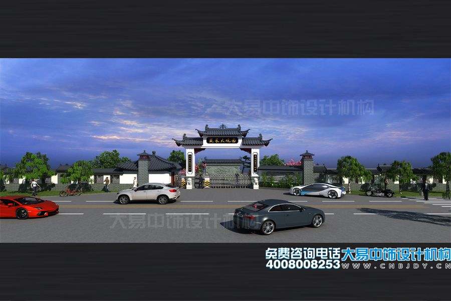 大門設計,采取了中式傳統建筑模式,突顯大氣、恢弘、莊雅的氛圍。