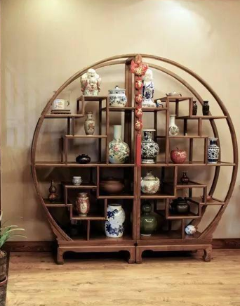 博古架又名“多寶格”,是室內(nèi)隔斷的一種,也可用來(lái)擺放古玩器物,富有觀賞性和實(shí)用性。月洞門博古架將“圓月”融入家具中,使家具更富有意韻。