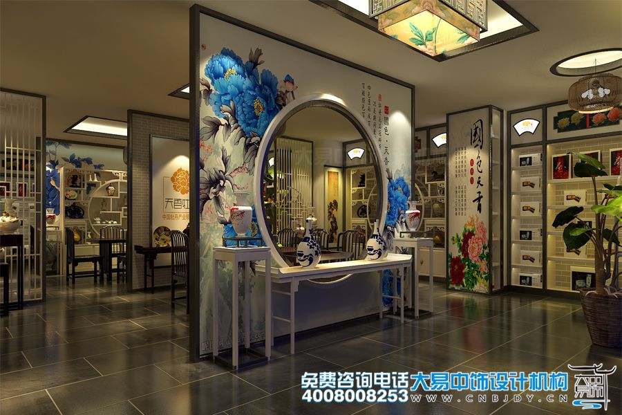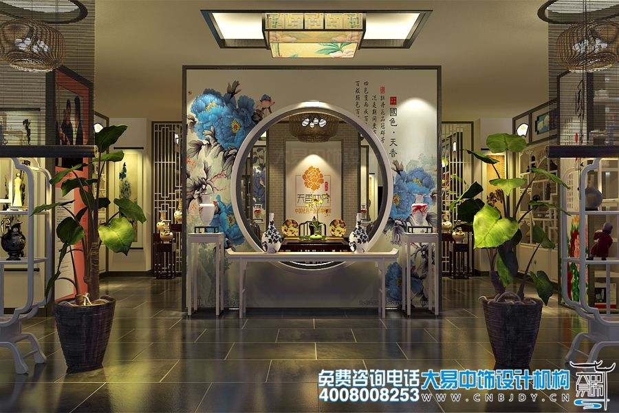 及進門之處,抬眼便望見的便是牡丹花在細節中的點滴滲透。以國畫為底色的中式屏風,中間采用圓窗借景,將中式設計的展示廳內空間縱向延伸,使得景致更加豐富。且圓形恰恰體現了牡丹“圓滿、濃情、富貴”的深層寓意。