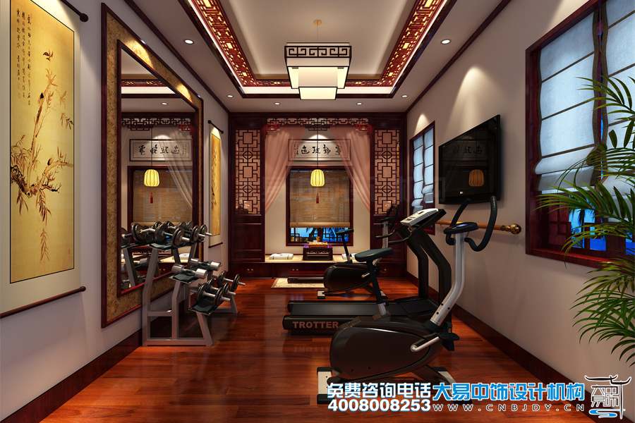 一樓中式健身房非常干凈,擺放的幾處健身器材,很有動感