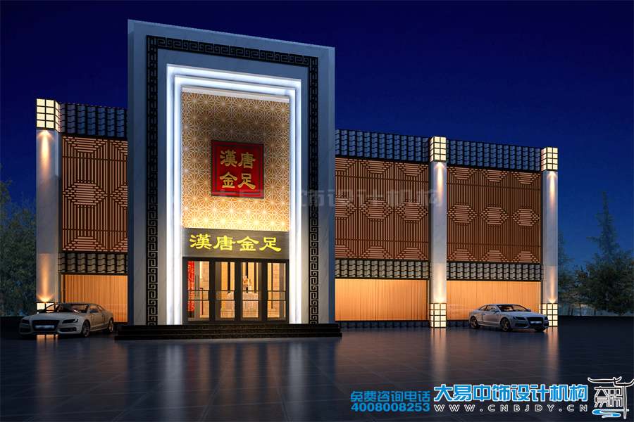 會(huì)所中式設(shè)計(jì)裝修,外景古樸自然,合傳統(tǒng)養(yǎng)生之法。大門(mén)兩旁以回形紋邊飾,有源遠(yuǎn)流長(zhǎng)、生生不息的寓意。漢唐金足四個(gè)大字以經(jīng)典的中國(guó)紅與黃色搭配,極具古典范。墻飾又以木欄與燈光相互輝映,古樸之外又不乏高端品味,更顯專(zhuān)業(yè)態(tài)度和文化底蘊(yùn)。