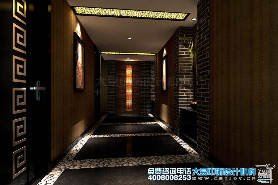 會(huì)所中式設(shè)計(jì)裝修,過(guò)道之處以大理石鋪就,兼有鵝卵石點(diǎn)綴,與足道理念契合。門(mén)飾依然有回形紋,灰色磚墻與原木色墻面配合古樸自然,悠然的燈光讓空間更具神秘色彩,靜、凈、境,無(wú)限意蘊(yùn)在細(xì)節(jié)之中展現(xiàn)無(wú)遺。