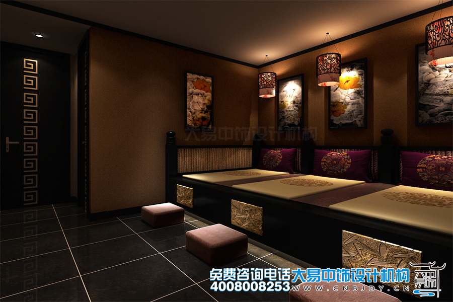 足道會(huì)所中式設(shè)計(jì)裝修,足浴包廂背景墻掛巨幅蓮花畫(huà)作,墻面多以原木色、米色等為主,側(cè)墻又懸掛書(shū)法作品,稍作點(diǎn)綴。燈光不宜過(guò)亮,氳影幽然,溫馨朦朧。靠墊上的刺繡也是極為傳統(tǒng)的元素,稍顯艷麗的顏色與整體色調(diào)相中和,恰到好處。