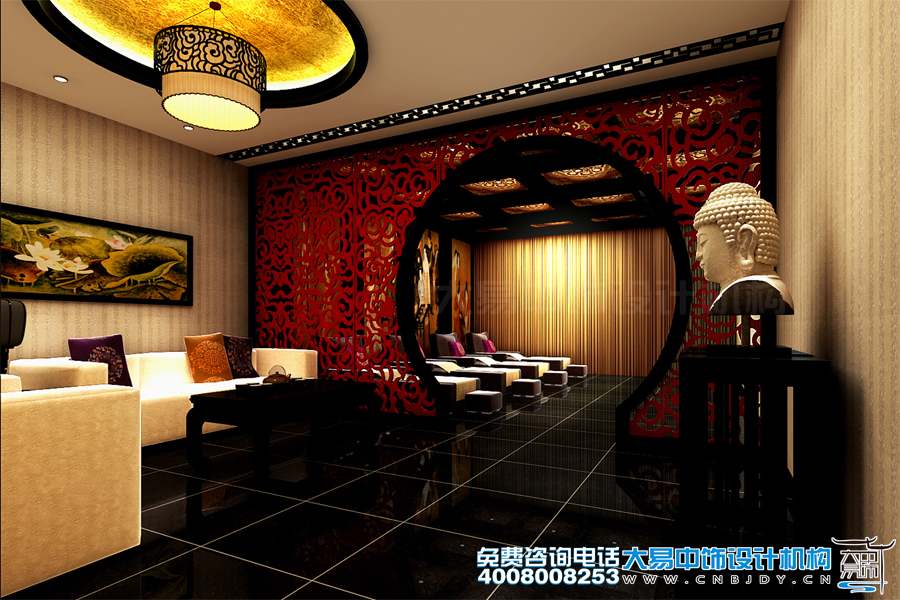 足道文化在我國(guó)歷史久遠(yuǎn),針對(duì)人體穴位的專(zhuān)業(yè)功法、泡足藥浴,從而達(dá)到養(yǎng)生保健的一種傳統(tǒng)中醫(yī)手法。既是傳統(tǒng)文化,足道場(chǎng)所的陳設(shè)就要起到烘托映襯的效果。此為大易中飾設(shè)計(jì)推出的漢唐金足休閑會(huì)所中式設(shè)計(jì)裝修案例,從足道會(huì)所外景至內(nèi)部陳設(shè),一應(yīng)為古典中式風(fēng)格,“蓮”這一典雅元素的運(yùn)用在此案例中十分豐盈,充斥在各個(gè)細(xì)節(jié)和環(huán)境中。因此漢唐金足不僅幽雅靜謐,還給人以禪意安然,與中醫(yī)養(yǎng)生之道也十分契合。讓來(lái)者在如此宜人的環(huán)境中得到全身心的放松和釋然。