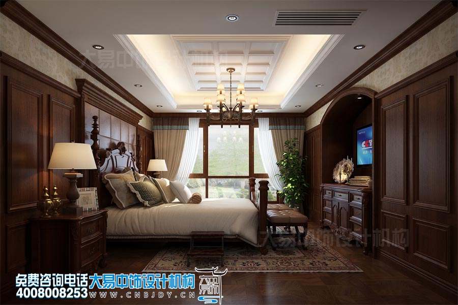 別墅臥室的設計裝修中,以原木色的木質家具為主,很好地保留了中式傳統,吊燈、床飾和細節上又兼有美式氣息。電視柜嵌入一體化的墻柜之內,墻面不加綴飾,原木色與白色協調搭配,給業主以舒適和安神的休息環境。