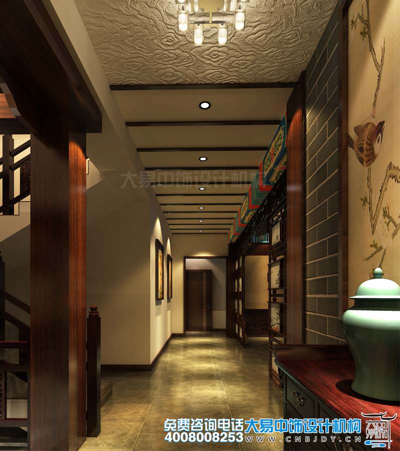別墅中式裝修上的樓梯位置也得注意,若是樓梯布置在房屋中央,則會發生喧賓奪主的現象。樓梯是用來行走的,上下人來人往,會讓此地喧鬧不寧,不但浪費穴眼,還會造成風水煞氣。時間久了,自然不會給業主帶來好運勢。所以,設計別墅樓梯的時候,大易中式設計師一般都是不會讓樓梯對著大門的。