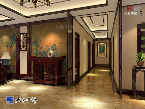 四合院豪宅進門門廳設的玄關中式裝修背景墻,保證私密的同時又有很好的裝飾效果。