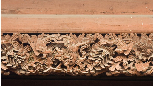 (七)掛檐板:即封檐板,也稱花板或檐下花板,保護檁條端部免受日曬雨淋。其題材常用花卉飛鳥、動物圖案等紋飾。工藝多采用隱雕,也有用淺浮雕的。