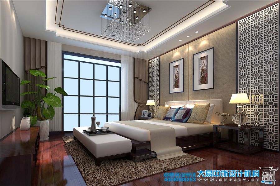 主臥室空間采取局部淺色中式窗花,體現(xiàn)出中式家居的空間化、舒適感