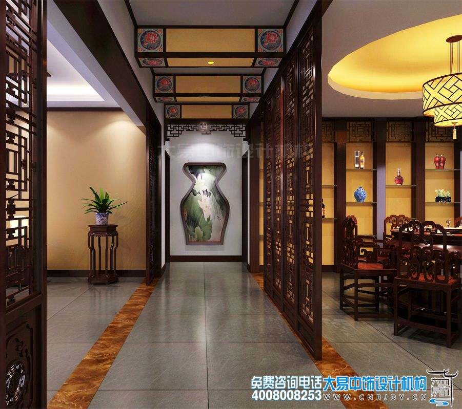 中式過道的盡頭是在墻面嵌入的景門樣式,內襯睡蓮圖案,設計師在此將藝術與古建造型巧妙融合,展現出業主對高品位文化氛圍的追求。這個角度可以清晰地看到進入房門之后的空間布局:左手處為餐廳,右手處為客廳,木紋地磚修飾過道,頂部的貼畫木欄點綴著空間,使得以灰色、紅棕色為主的居家環境活躍生動起來。