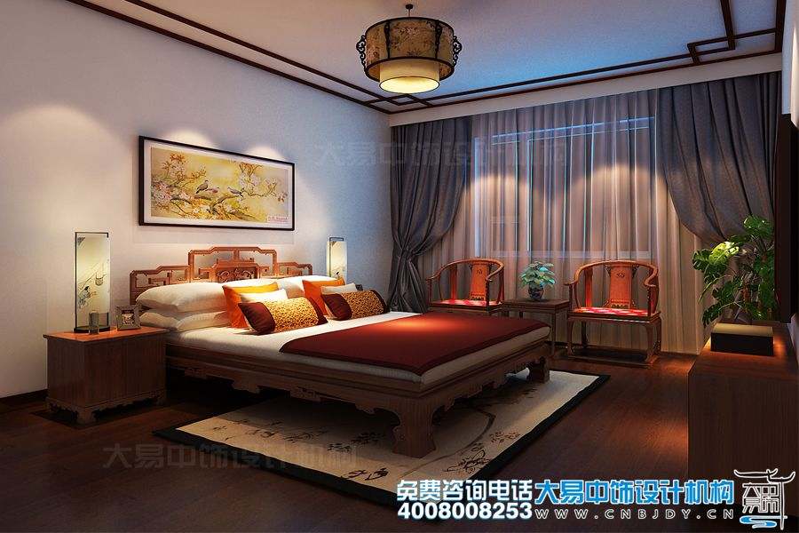 臥室中式設計裝修,實木床具雕工精細,能工巧匠讓每一處刻度都透露出生命的暖意,配套的椅具側立床邊,原木色調給人以安神的靜謐感。同樣別致的還有床頭的臺燈,壁畫、地毯,于點滴間彰顯中式格調的清新。主臥室素雅潔凈的床品,在自然凝練的格調下,裝點了中式生活的浪漫溫馨感。
