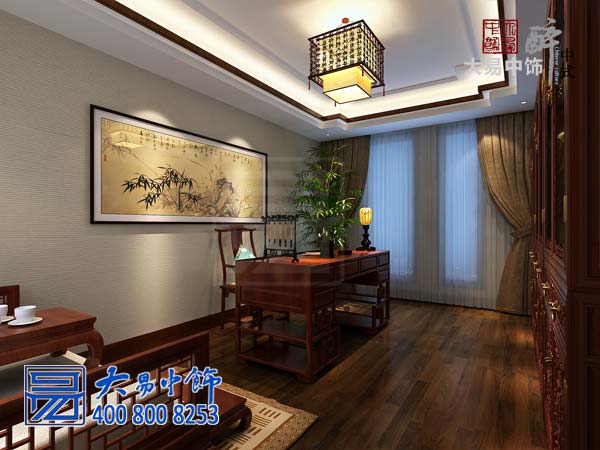 書房的設計頗具文人的清雅高潔之氣。雕花書桌,文房四寶俱全,背景墻以竹韻詩畫裝裱作品。墻角幾株翠竹,吊燈用鏤空字紋木框,四角飛揚的流蘇,在上空散發出書香氣息。