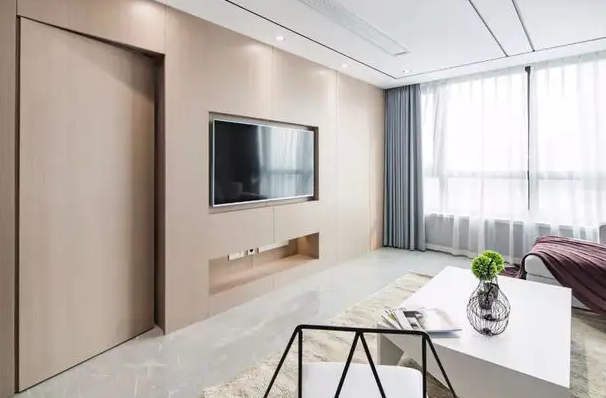 當(dāng)電視墻上有房門的時候,在設(shè)計(jì)電視墻的時候就可以在電視墻上加入木飾面的設(shè)計(jì),然后房門也在木飾面的廠家一起做,這樣讓木飾面與房門保持一致的木色,也可以讓電視墻最大程度保持統(tǒng)一的視覺設(shè)計(jì)。