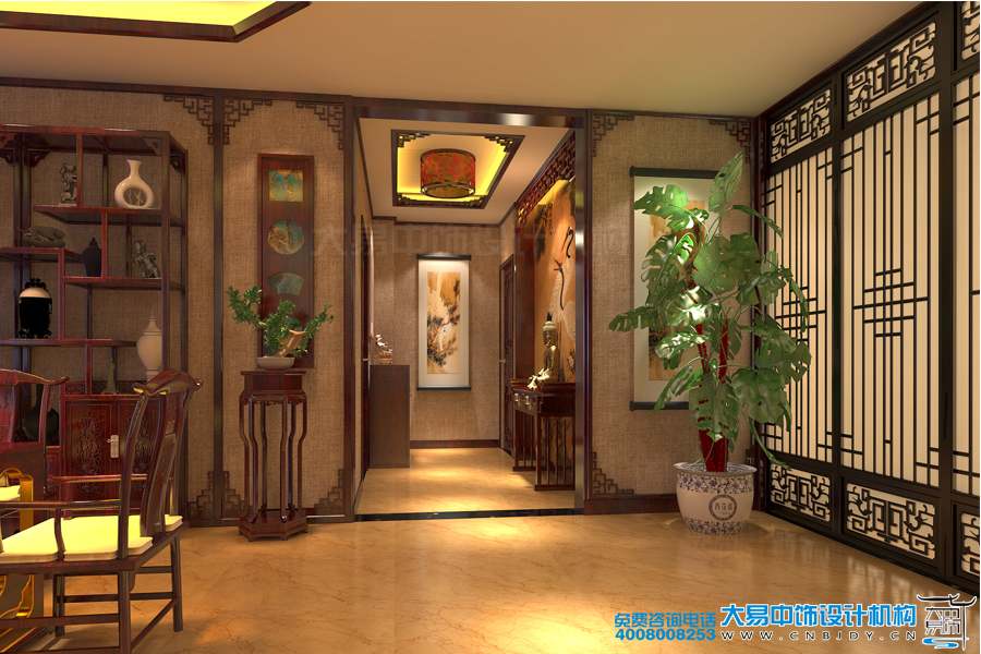 過道背景精致而古雅,這是古樸新中式的典型再現