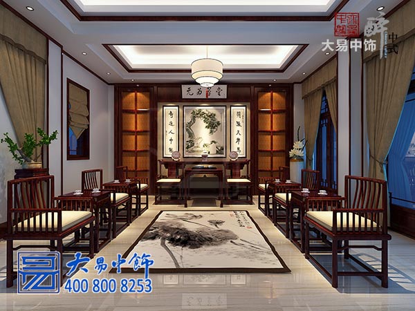 禪修別墅中堂中式設(shè)計(jì),簡(jiǎn)約木欄吊頂讓頂部空間在方圓之中渾然一體,正堂背景以掛畫、木屏為飾,以條案置放香鼎、坐屏,映入眼簾的是濃濃的傳統(tǒng)中式氣息。左右兩列圈椅依次排開,紅木家具與白瓷地板以及淺黃色地毯搭配相襯,以顯和諧靜雅之風(fēng)。落地窗搭配素色帷幔,與百葉狀的竹簾相宜,古樸自然。