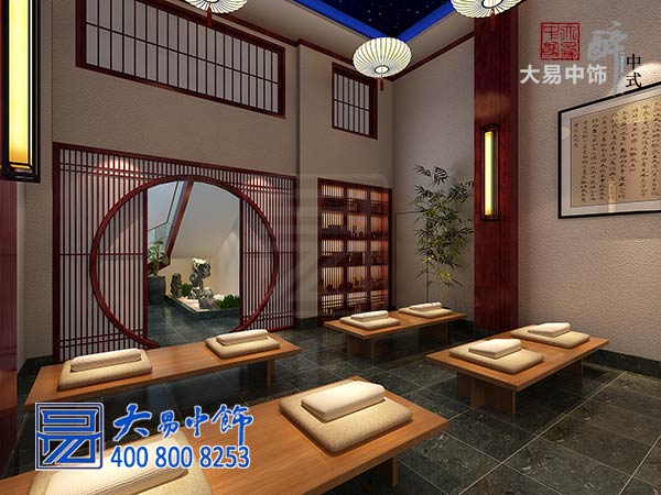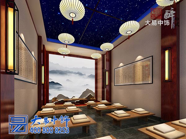 負(fù)一層禪堂是此禪修別墅的主場(chǎng)地。因是禪修所需,一切以修心為上,在外部裝飾終力求簡(jiǎn)潔、明朗、淡雅的色調(diào)。墻面有壁燈為飾,懸以巨幅佛經(jīng)書法作品。整體墻面以底色白色為主。正堂為巨幅山巒水墨丹青,遼闊高遠(yuǎn),溢于畫外。