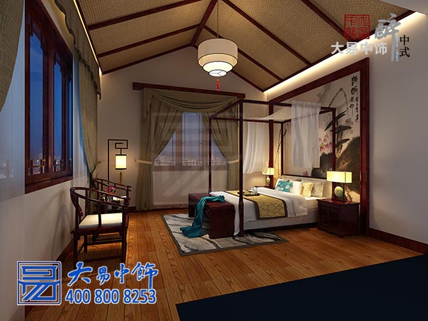 禪修別墅中式裝修,臥室采用人字形吊頂,宮燈高懸,映照出室內(nèi)的樸素質(zhì)感。